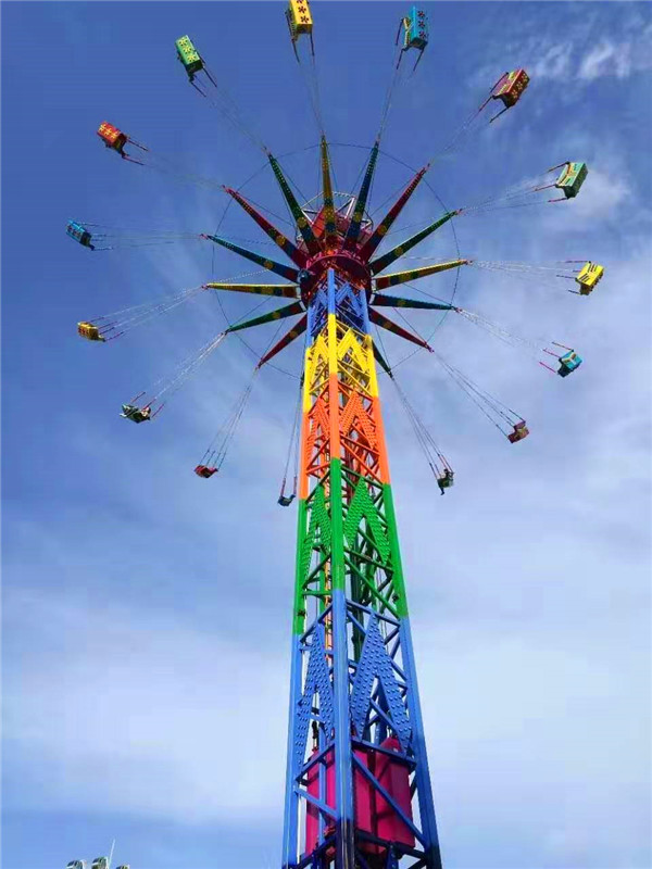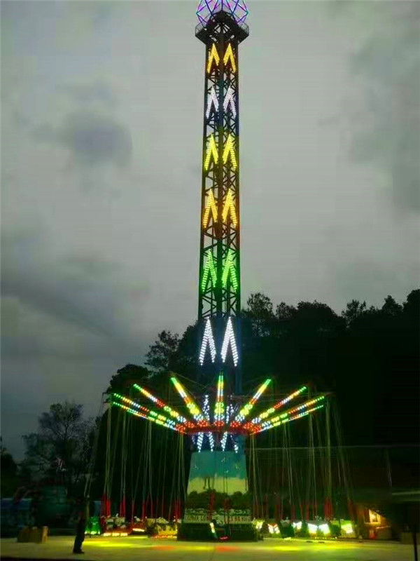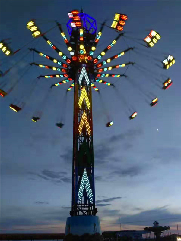 夜晚來臨,其高聳的塔身,在游樂園中更顯尊貴;五彩的燈光,在隨乘客旋轉(zhuǎn)運(yùn)動中,猶如一道道彩虹當(dāng)空舞,更顯絢麗奪目,富麗繽紛。