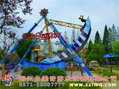 兒童游樂設備海盜船是一種全新設計的觀覽車類游藝機,是一種繞水平軸往復擺動的游樂項目,該種游藝機因造型圖同而名稱各異,“海盜船”因為其外形仿古代海盜船而得名。海盜船造型為美洲印第安部落風格,總高度7.2米,大擺角45度。