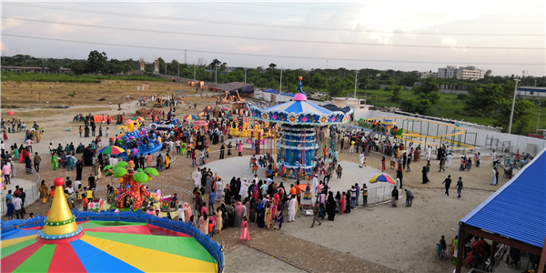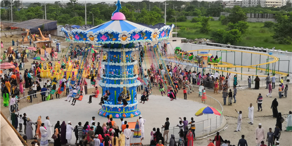 颶風飛椅轉動時,乘坐在吊椅上的乘客猶如在藍天飛舞,體驗刺激收獲快樂。颶風飛椅是集旋轉、升降、變傾角等多種運動形式于一體的大型飛行塔類游藝機。當傘形轉盤和中間轉臺反向旋轉啟動時,塔身徐徐上升,此時轉盤搖擺,飛椅呈波浪蕩漾狀,游客猶如在空中飛翔、飄蕩,海闊天空、驚心動魄。設備巍峨雄偉,它柔和了絢麗的燈飾和七彩繽紛的圖案設計,造型華麗,是目前游樂場上漂亮、吸引人的游藝機之一,也是標準的主題公園或現代游樂場的選擇項目之一。