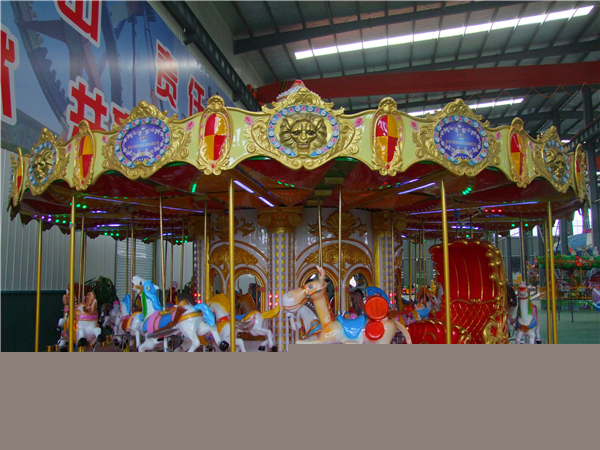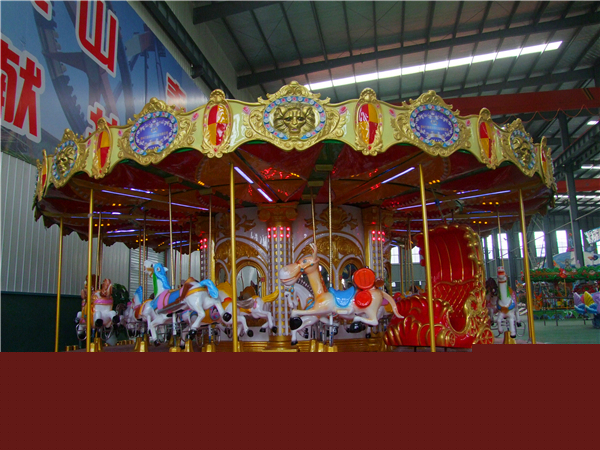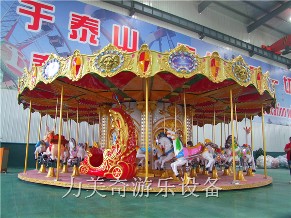 鄭州力美奇游樂設備有限公司生產的36座豪華轉馬,內外頂棚及中柱都采用了玻璃鋼材質,由無數匹馬兒、豪華馬車、小驢、鴕鳥、長頸鹿、鴕鳥、獅子等動物組成,頂部有華麗無比的皇冠。當夜幕降臨,五顏六色的燈光亮起,更顯現出它的豪華跟華麗,成為樂園很耀眼、受歡迎的焦點項目。