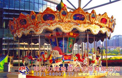 旋轉木馬或回轉木馬游樂場機動游戲的一種,即旋轉大平臺上有裝飾成木馬且上下移動的座位供游客乘坐。很早記錄的旋轉木馬出現于拜占庭帝國時期。約1860年歐洲出現排名靠前個以蒸汽推動的旋轉木馬。旋轉木馬成為每個大人孩子心中的童話世界不可缺少的裝飾,如今在各大小游戲場、商場等地方皆有各式旋轉木馬。
